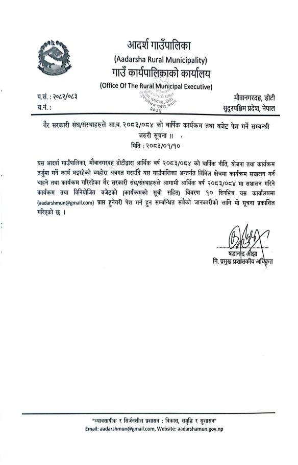 गैर सरकारी संघ संस्थाहरुले आ.व 2082/84 को वार्षिक कार्यक्रम तथा बजेट पेश गर्ने सम्बन्धी जरुरी सूचना ।।